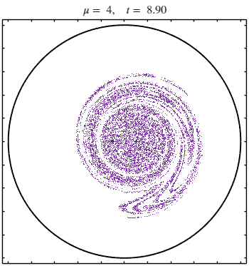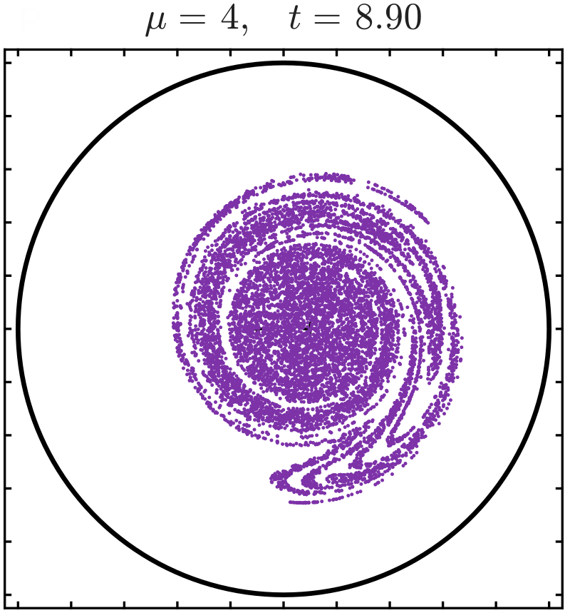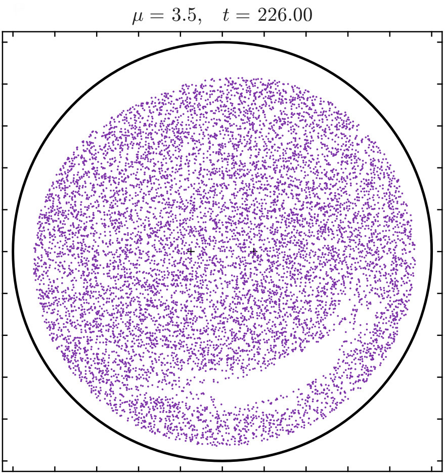 For this example, I’ll use a figure with lots of particles (dots) in a circular boundary, with a title placed above the axes. It’s important to keep in mind that in MATLAB’s figures, the size of elements like ‘LineWidth’, the ‘FontSize’ of titles/subtitles, or legends, are sized relative to the screen size of the figure. That is to say, if I increase the figure size, the relative size of those elements will decrease. This is fine in and of itself, but something that always needs to be kept in mind. For instance, what if I manually size the figure so that the ratio of the size elements and axes are as desired, but I want to export the figure to a larger or smaller pixel size than what is displayed? Controlling both of these variables—figure size and resolution—are of principal importance when exporting a sustainable number of figures. If I’m combining the images into a video, it will likely find itself on a google slides presentation or this website, both of which are going to place restrictions on storage size of the video. Alternatively, if storage size is not an issue, I want the images or videos to look as nice as possible, which necessitates finely controlling the relative size of the figure’s elements, and the resolution. With these objectives considered, here are a few ways to automate the export process of figures in MATLAB.